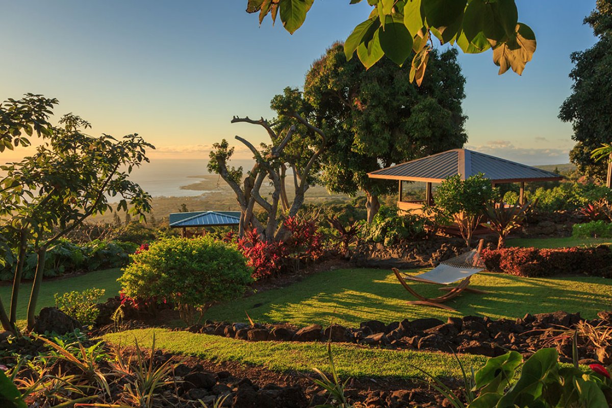 Come discover the perfect blend of casual elegance meets Polynesian luxury. This Hawaii Bed and Breakfast features spectacular Pacific Ocean views on 30 lush acres of well-tended tropical fruit and flower gardens and 5,100 Kona Coffee trees. A stunning custom-tiled mosaic pool, hot tub, six exquisite guest rooms, a private honeymoon cottage, and rooftop, pool, and garden gazebos have delighted guests for years. Come experience first class service with exceptional Aloha Spirit.