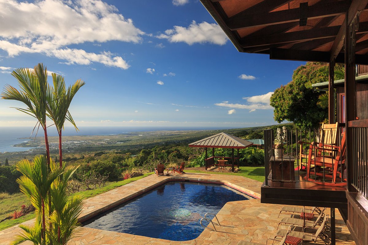 The beautiful pool at Holualoa Inn looks out high above the Pacific Ocean