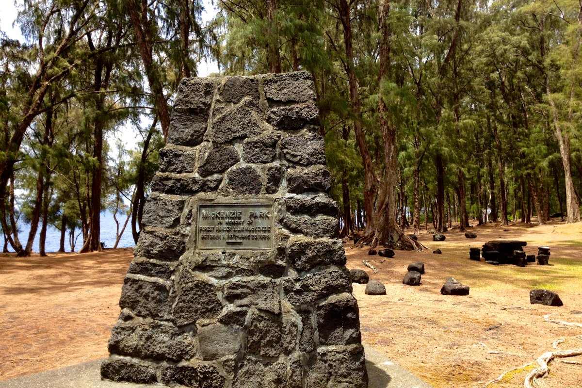 In the parking lot is a sign indicating a portion of the King's Highway. It was built by order of King Kamehameha and later repaired by convicts in 1850. Just north of the parking area are some old lava tubes which might be worth exploring. Wear sturdy shoes and bring a flashlight. To get to Mackenzie take Highway 130 south from Pahoa. When it dead ends at Highway 137, turn right. Highway 137 meets and turns into Pahoiki Road for 2 miles. Then Highway 137 turns off to the left. Follow the highway. The park will be on the left after mile marker 137.