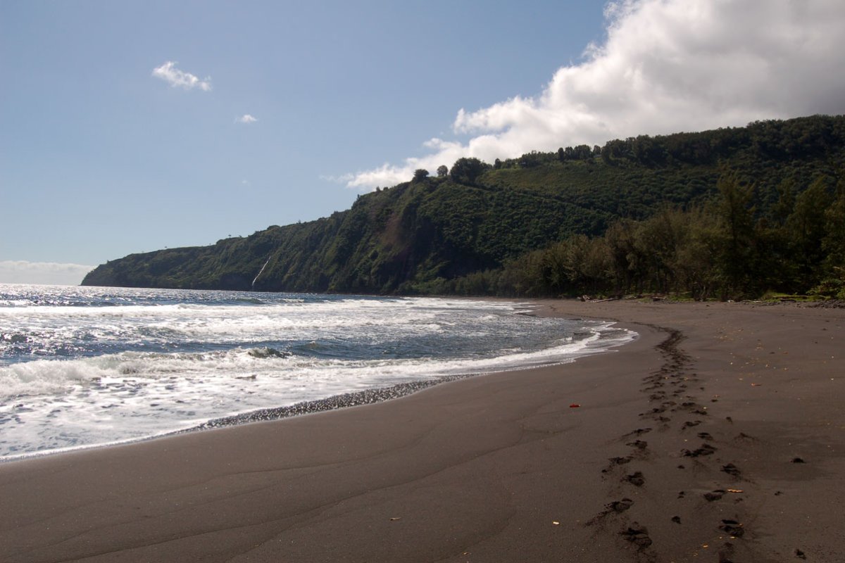 The Muliwai Trail to Waimanu Valley is a strenuous 9-mile switchback trail that climbs 1,200 ft to the top of a ridge, then descends into the Waimanu Valley. The views into Waipio Valley as you start up the trail (often called Z-Trail) are incredible. Z-Trail Now, if you thought the view from the Waipio Valley lookout was fantastic. We recommend hiking across Waipio Beach to the other side and up the valley wall for a peek into the heart of Waipio. You can see the trail from the lookout. It is the zigzag cut into the side of the cliff. When hiking across the beach you will have to wade through Waipio River which dumps into the ocean. Only try this when the tide is low and always try to gauge the speed and depth of the water before crossing. If you are wearing hiking boots, bring water shoes for this part of the journey. Your feet will thank you later. Once you are at the end of the beach a small path leads to a gate. Do not go through the gate, instead look to your right for several signs that mark the trailhead. The walk to the third (and best) switchback is only about half an hour. The trail begins in a very wooded and mosquito-ridden area but eventually opens up on the side of the cliff. Once you reach the third switchback, turn around and take in the vast natural sight before you. From this side of the valley, you can see deep into the heart of Waipio. If you look closely you should be able to see the lookout and parking lot. From this vantage point, you can see the cascading Hi'ilawe Falls flowing through a crease in the valley wall. Notice how far back the valley reaches as it cuts around gently sloping cliff sides.