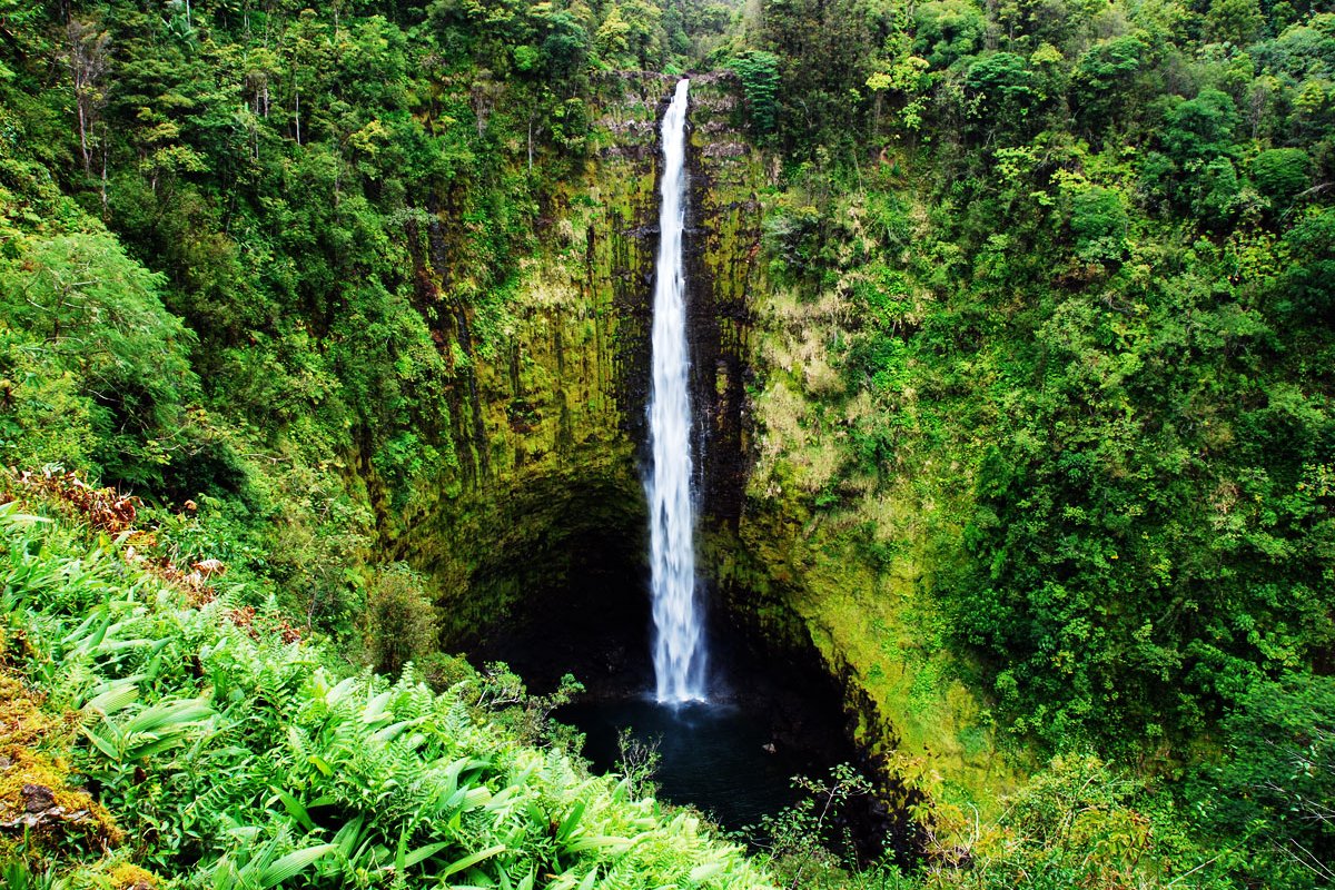 Everywhere you look, you are surrounded by gorgeous plants including giant ti plants, birds of paradise, torch ginger, bamboo, and split leaf philodendron. You will hear the dull roar of the waterfall before you see it. Just as you round a corner, you'll catch a glimpse of Akaka Falls free falling 442 ft. Through a green-lined gorge. In our opinion, the best time to photograph the falls is early in the morning on a slightly cloudy day; the filtered sunlight allows the greenery to accentuate Akaka's misty waters.