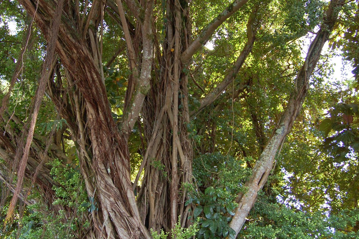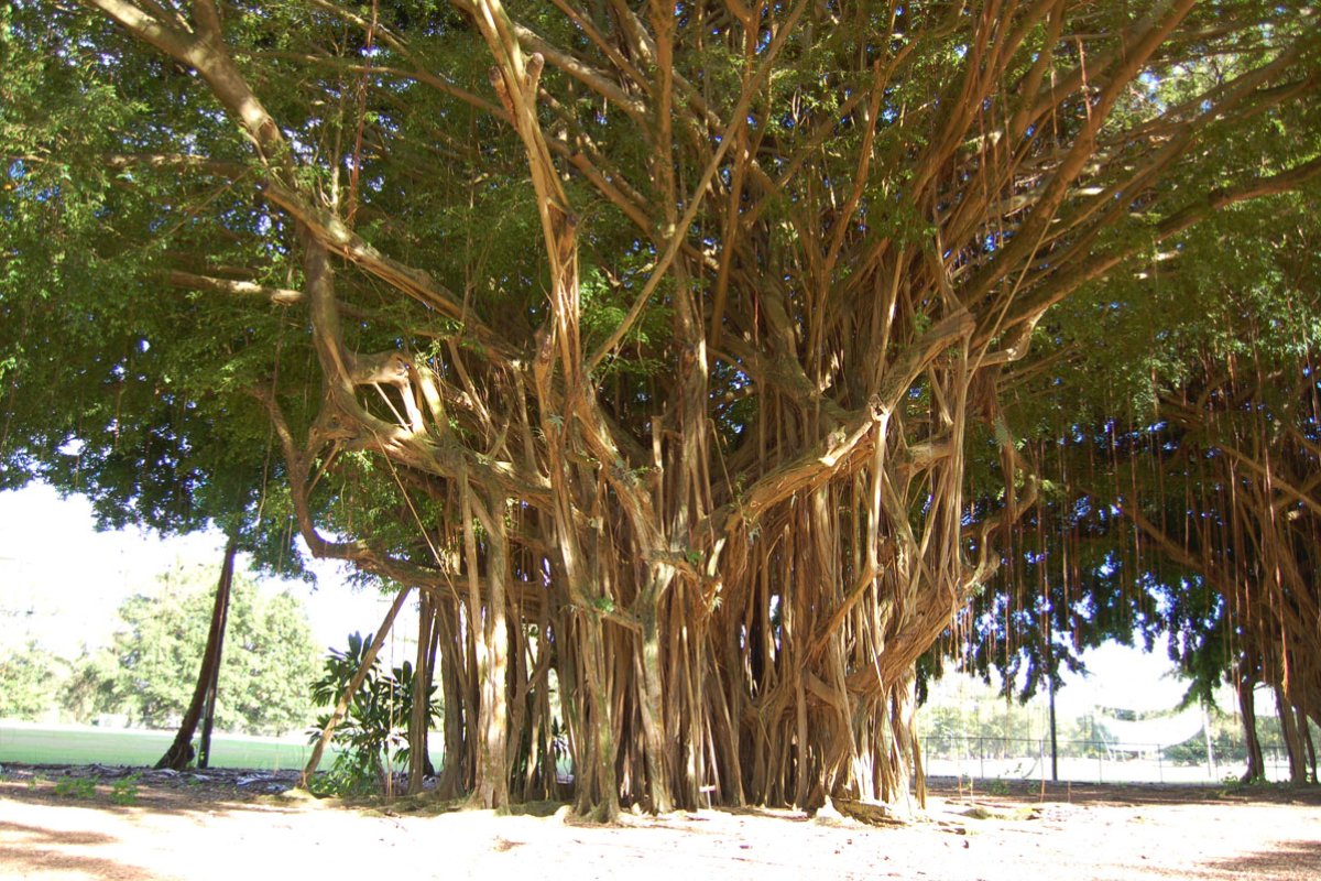 Banyan Tree Drive is composed of a canopy of banyan trees outlining the Waiakea Peninsula. The Hilo Parks commission began lining the entire drive with banyan trees in 1933, most have plaques denoting which celebrity planted them and when.