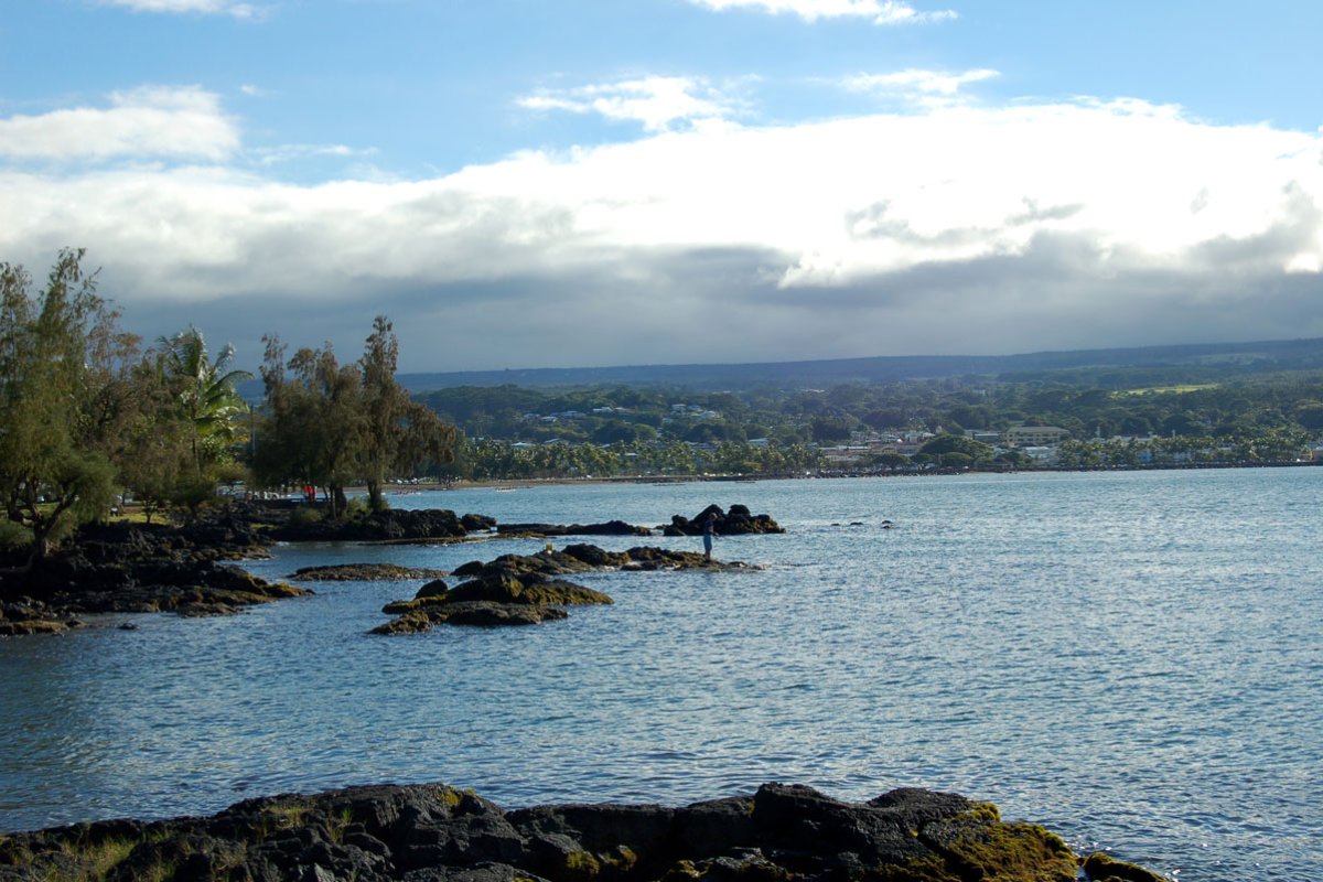 One of the gorgeous views of Hilo Bay is from the edge of the gardens. The sun glistens on the calm bay waters while palm trees gently sway in a warm breeze, and in the distance, you can see clouds banking on the slopes of Mauna Loa.