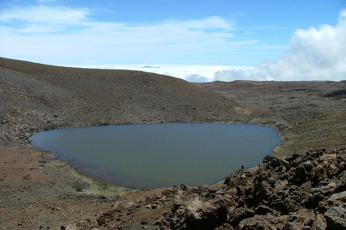 At 13,020 feet lies one of the most significant areas on the volcano, Lake Waiau. Nestled in the shadow of the cinder cone Pu'u Waiau, the lake, which is fed by permafrost, gives off a bluish-green tint. It is a tradition among many Hawaiian families to take the umbilical cord of a newborn child up to the mountain and place it near Lake Waiau to symbolize the family's connection to the Earth. Since the lake is considered to be where spirits enter and leave the world, many chiefs are buried near there.