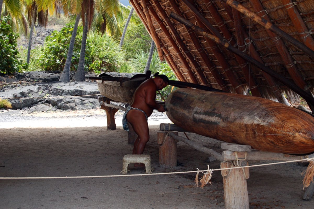The pamphlet available at the entrance provides explanations for all of the numbered sites on the grounds. One site is a game of konane which was played using pebbles on a stone table. All the structures such as the temple and the huts were carefully recreated using traditional methods. Ti leaves, the multi-purpose plant of the Hawaiians, were used to thatch the roofs, and to make rope and skirts for the hula. The halau, a working structure, shows how the leaves were used and how the double-hull canoes were built and then launched from the small Keone'ele Cove on the grounds.
