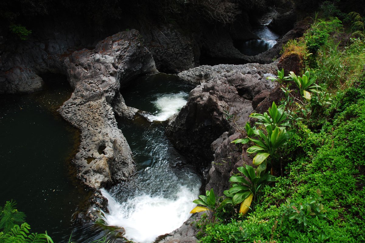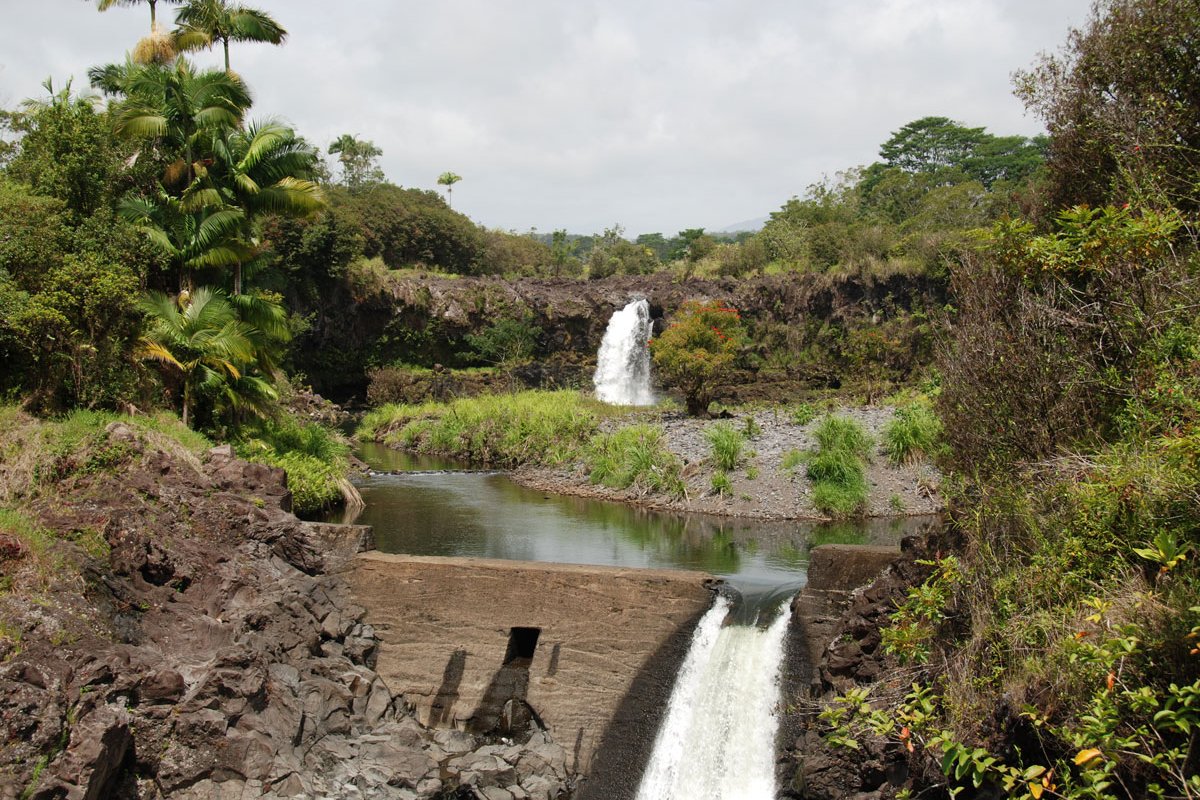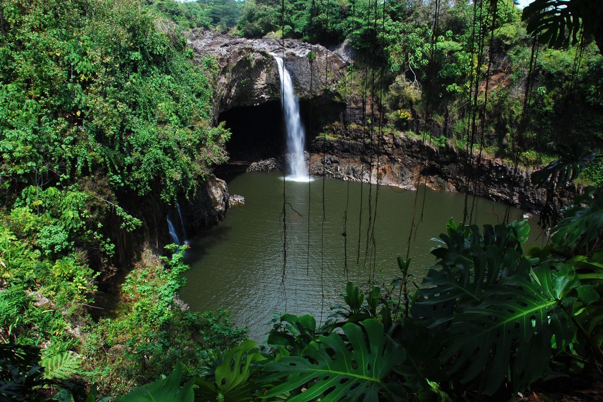 Just outside of downtown Hilo, 16-acre Wailuku River State Park is home to several of the most striking waterfalls in the area. Among the several falls which occur along the Wailuku River are 80-foot Rainbow Falls which takes its name from a rainbow formed by the mists and sunlight, Pe'epe'e Falls (upper right) and Boiling Pots, a series of large pools whose water appears to be boiling as it rolls over many rocks en route to the ocean. The depressions are caused by swirling rocks. Wailuku River State Park is located near downtown Hilo on the leeward side of Hawaii. It can be accessed from Waianuenue Avenue with the boiling pots on Pe'epe'e Falls Drive and Rainbow Falls on Rainbow Drive.