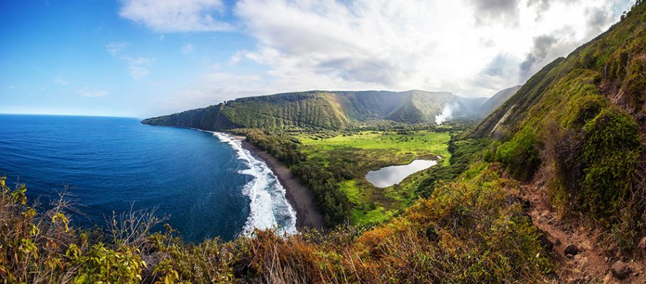 The lookout overlooks a pristine valley, often referred to as the Valley of the Kings, with cliffs that sharply rise above and frame a lush paradise beneath. In fact, these cliffs reach almost 2,000 feet in height and are freckled with waterfalls and flowers that add to Waipio’s beauty. Few Hawaiians reside in the Waipio Valley, the largest and farthest south of all valleys on the Big Island.