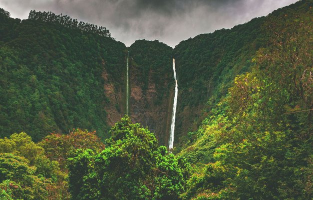 Water tumbles down 1,450 feet to become one of Hawaii’s largest waterfalls: Hiilawe Falls. The waterfall falls from a cliff in the Waipio Valley.