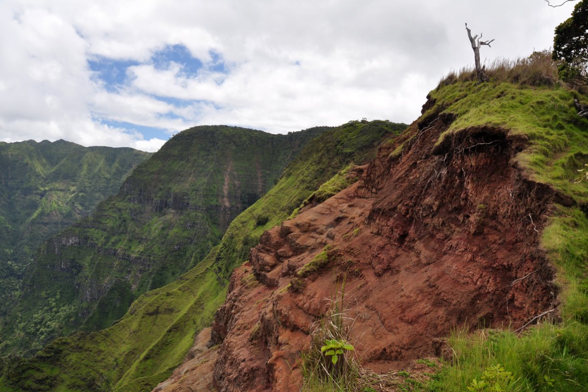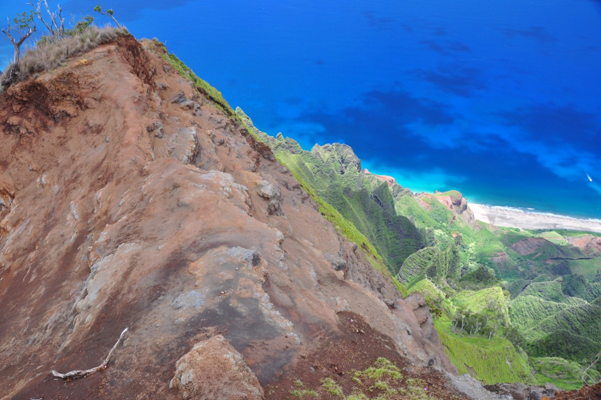 The panoramic views into Kalalau Valley as you hike out onto the ridge stretching towards Na Pali are simply incredible. Although it is a relatively short hike, there are numerous steep sections that can be especially difficult to navigate in wet weather, as noted above. The trail can become very slippery, and there are several places where the trail runs right at the edge of a 1000' drop, so hikers must maintain awareness of their surroundings at all times.