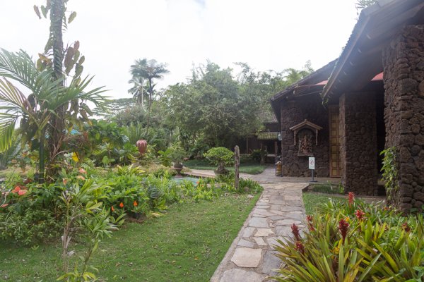 Feeling totally nestled among the tropical landscape, I took a peek out beyond the gardens and was floored at the breathtaking vista of the Wailua River with its pond and the Wailua waterfall. Signage indicated that Hawaiians named this natural pond and waterfall Nani Kaua, which means "beautiful rain," in tribute to the stunning falls that follow heavy rains. The lookout offers a distant view of the still-under-construction Iraivan Temple and beyond that, you can see the extinct volcano, Mount Waialeale. After a heavy downpour, it is said that this exact spot offers views of over 54 waterfalls, some over 1,000 feet tall!