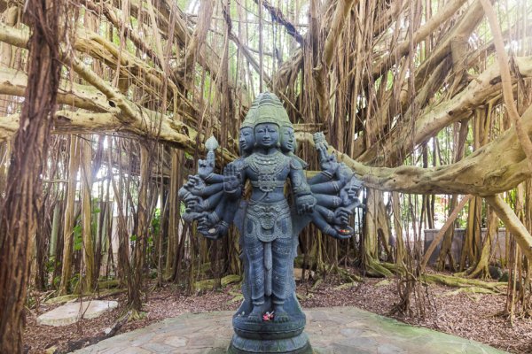 At the entrance I learned that I needed to cover my legs before continuing—I was wearing shorts—and a sign suggested I use one of their sarongs to cover up. The dress code encourages traditional Hindu clothing, though modest clothing is permitted. No shorts or tank tops are allowed. Sarong in place, I ventured onto the property with no idea what was ahead. After all, many of my favorite travel moments are the ones least expected. I came upon a giant banyan tree with a granite sculpture of Lord Shanmuga, the six-faced deity, in the center. What a sight!