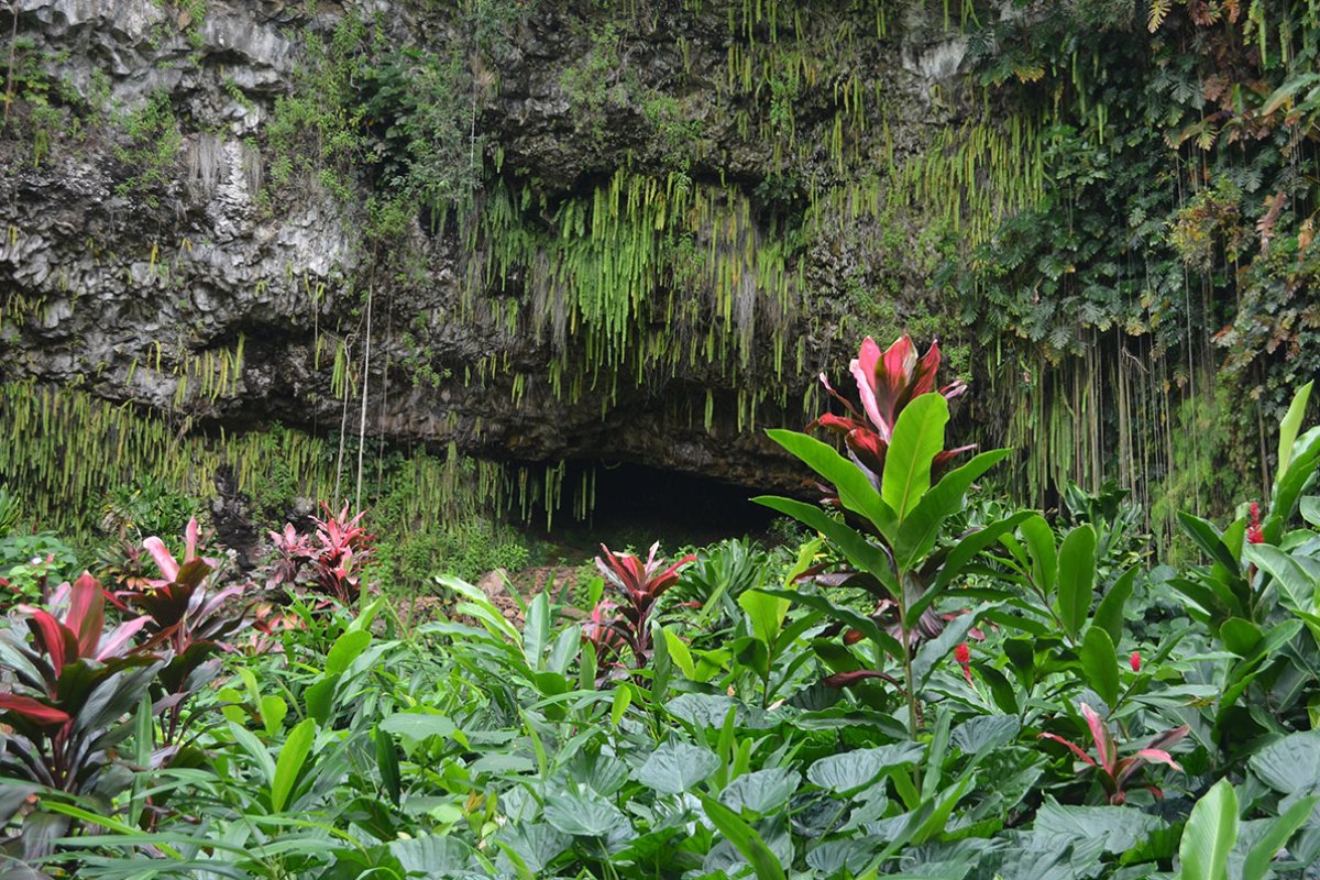 The Fern Grotto is a large natural amphitheater with hundreds of ferns draped from it. The gardens leading up to the amphitheater are full of tropical plants and fl owers, including the incredible split-leaf philodendrons or swiss-cheese plant - one of our favorites. It is actually native to Mexico, but it makes for a lovely addition to Hawaii's jungles.
