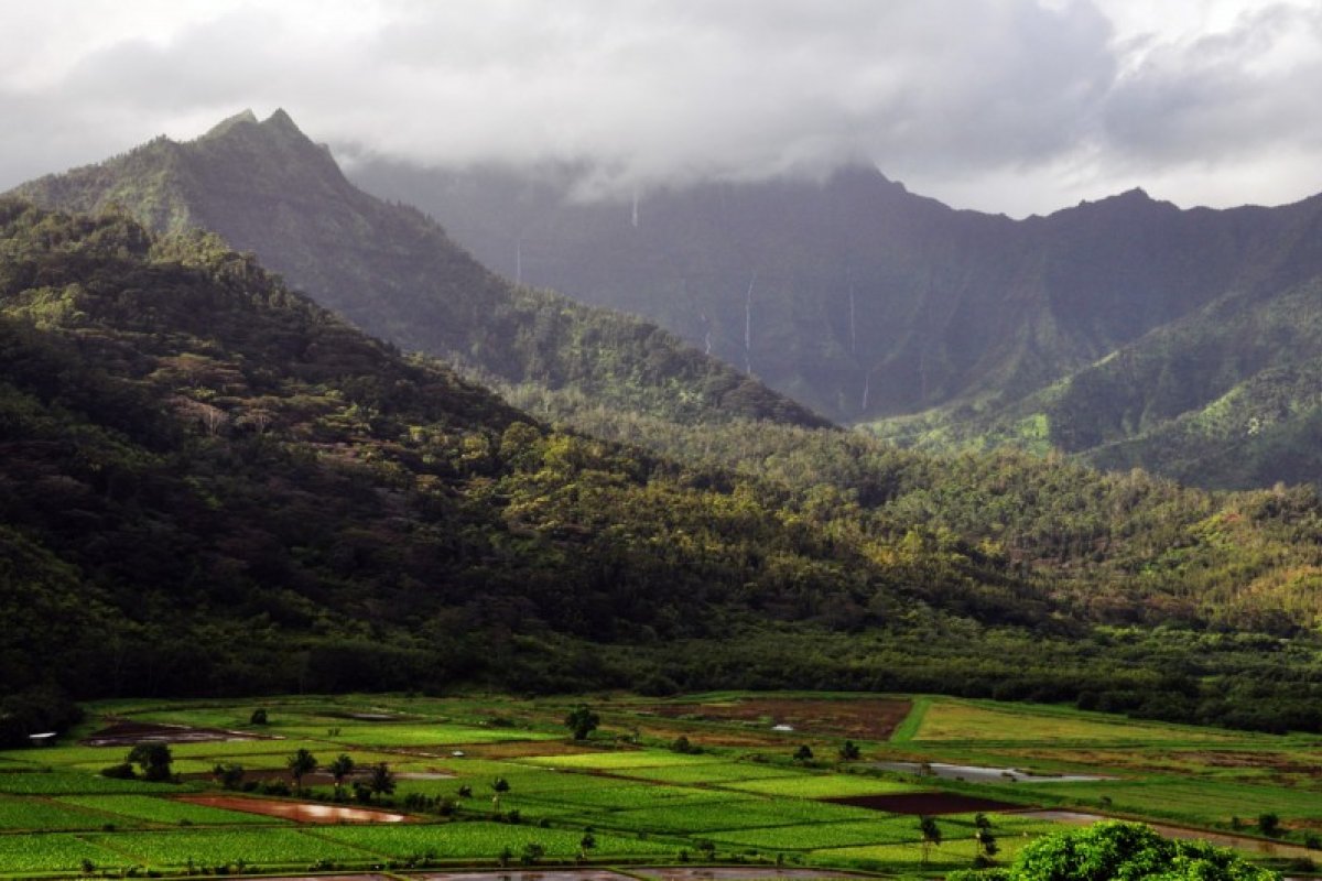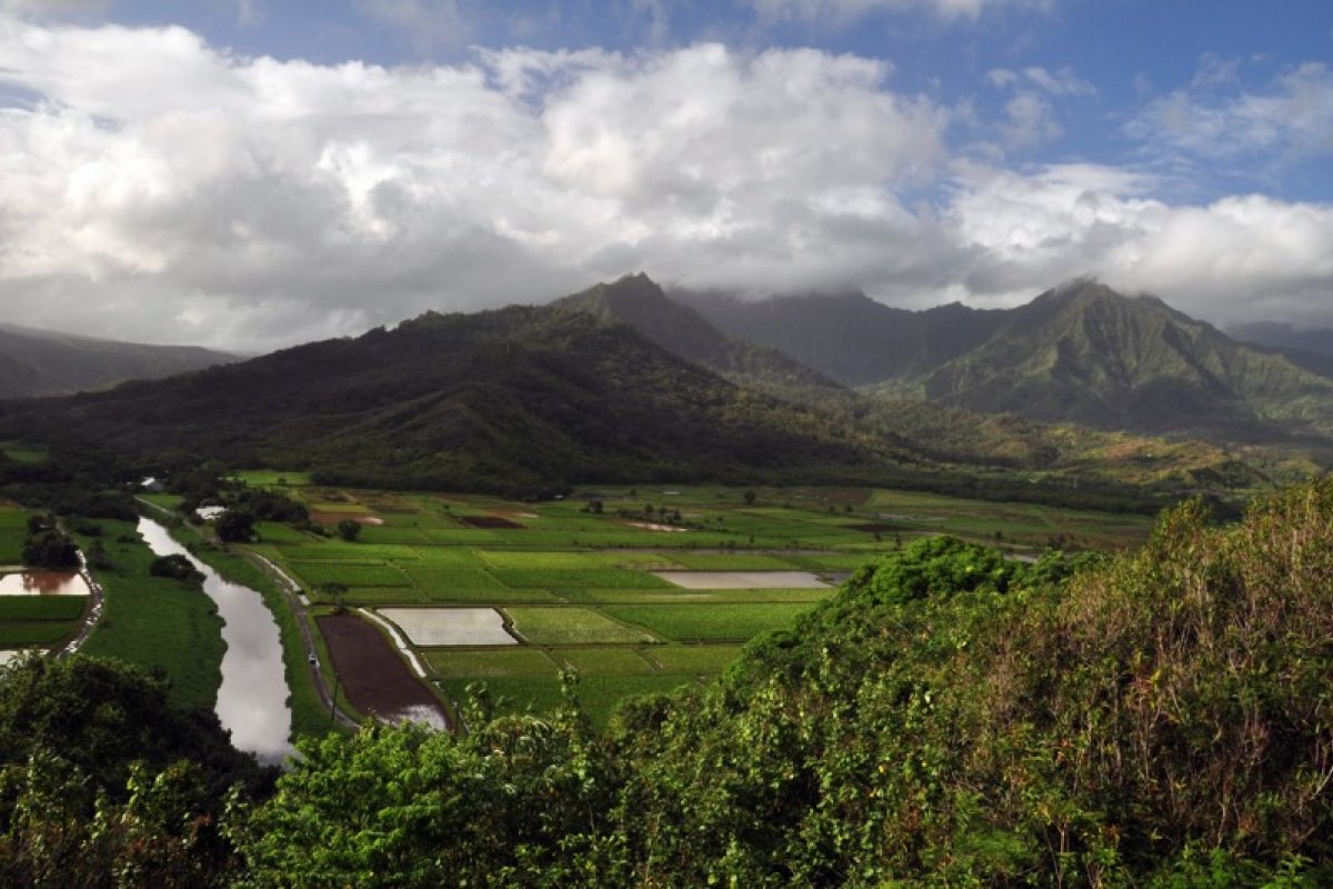 Hanalei Valley on the north shore of Kauai is one of the most attractive places on the entire island. The backdrop of beautiful mountains with waterfalls tumbling down the walls is a beautiful stage for the sleepy town of Hanalei. The most scenic view is here at Hanalei Valley Overlook, which peers over the taro fields of Hanalei Valley below. The valley is a designated Wildlife Sanctuary rich in native water birds including the Hawaiian coot, duck and stilt. The dramatic patchwork of neat taro farms bisected by the wide Hanalei River make this one of Hawaii's loveliest sights. The fertile soils of Hanalei Valley have been planted with taro since perhaps as far back as AD 700.