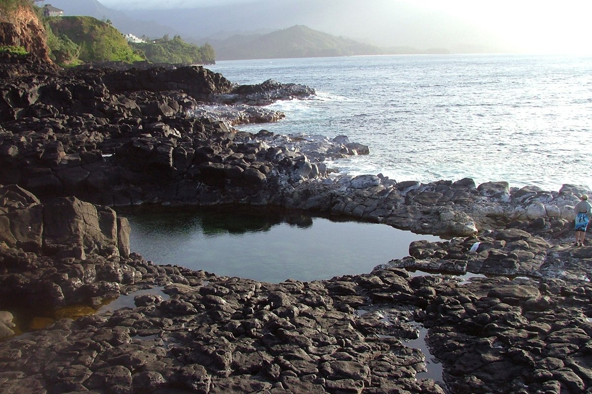 Queen's Bath is located inside the high-class neighborhood of Princeville. Queen's Bath is a large natural pool that has been carved out of a lava shelf.