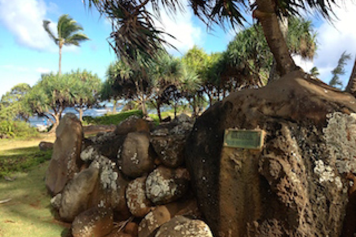 >The first site of significance is Hikinaakala Heiau, (which means Rising of the Sun) built approximately 1,200 years ago at the river mouth of what is today called Lydgate Park. It is said to be located at the exact point where sunlight first touches the eastern shore of the island every morning. It was also oriented to the North Star. The walls of the heiau were once 6 feet high and 11 feet wide. This Heiau includes the Hauola place of refuge, which can be likened to the purpose of a jail where people who broke a kapu (law) would be sent to find refuge from being killed which was the likely outcome of such an act. They were allowed to leave when they took responsibility for their actions. Fascinating Ki’I Pohaku (ancient Hawaiian petroglyphs) can also be found at the mouth of the river near the heiau.