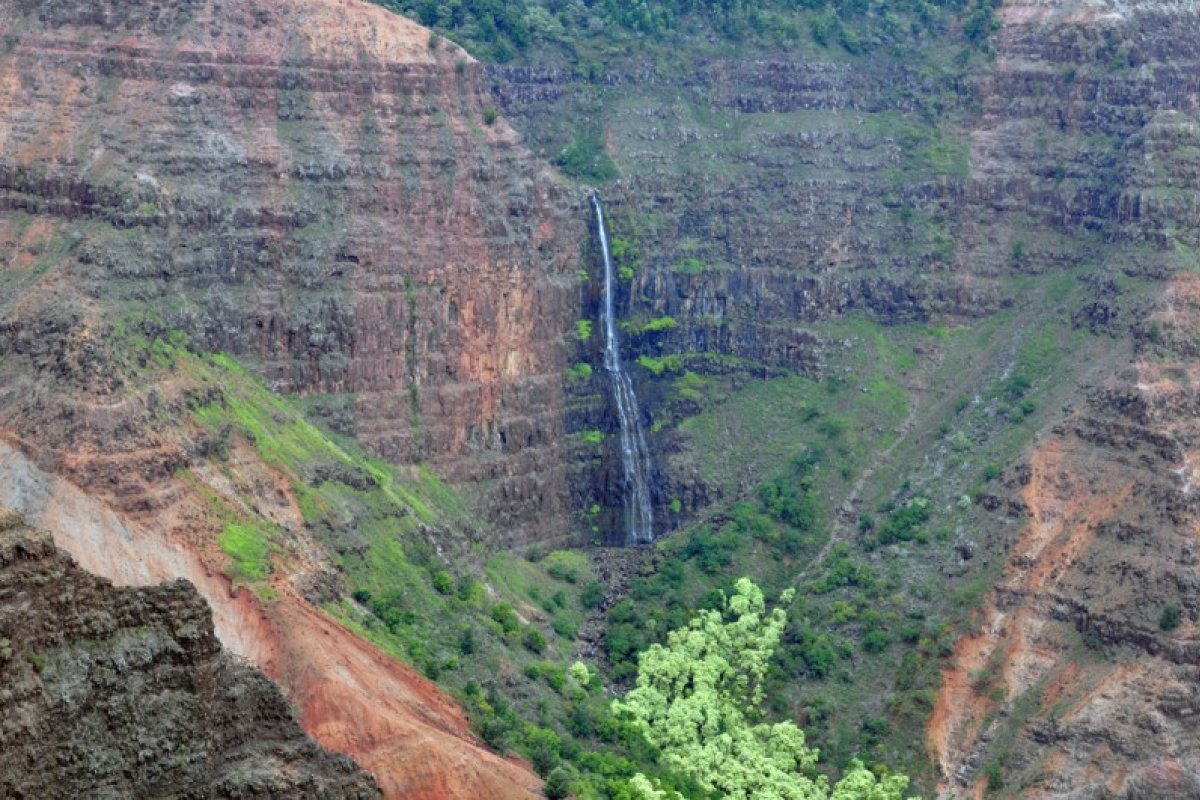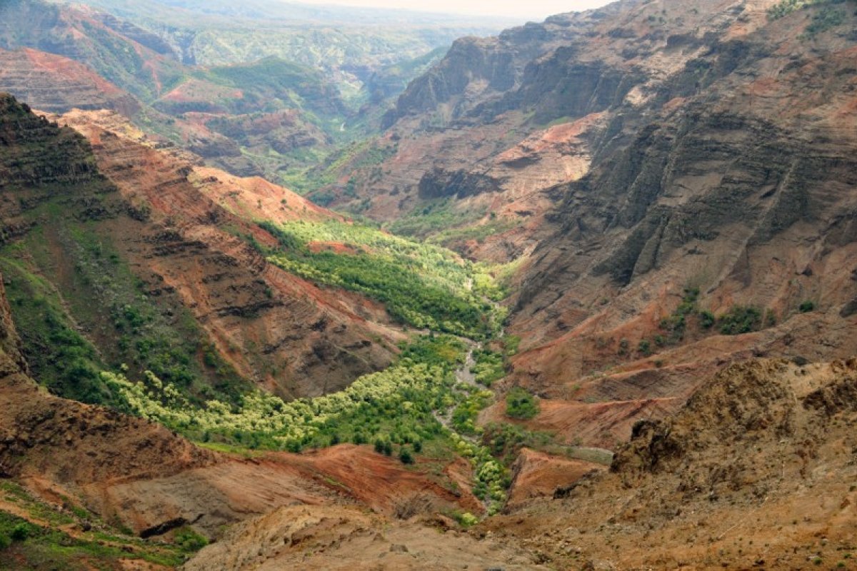 Carved thousands of years ago by rivers and floods that flowed from Mount Waialeale's summit, the canyon is home to the Waimea River. The river was named for the red hue of the water, as Waimea means 'red waters.' The red tint is caused by several natural processes that break down the ancient rock inside the gorge. Like the Grand Canyon in Arizona, through the processes of weathering (precipitation), mass wasting (gravitational breakdown), and erosion (by the river), the walls of Waimea Canyon are literally being rusted, broken down, and carried out to sea over time. From space, you can even see the tinted runoff making its way into the ocean.