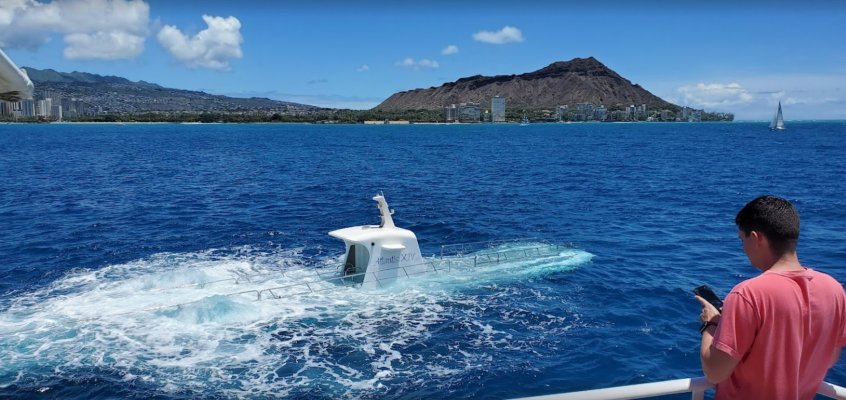 Your ride for the day? The Maui submarine departing from Lahaina Harbor.