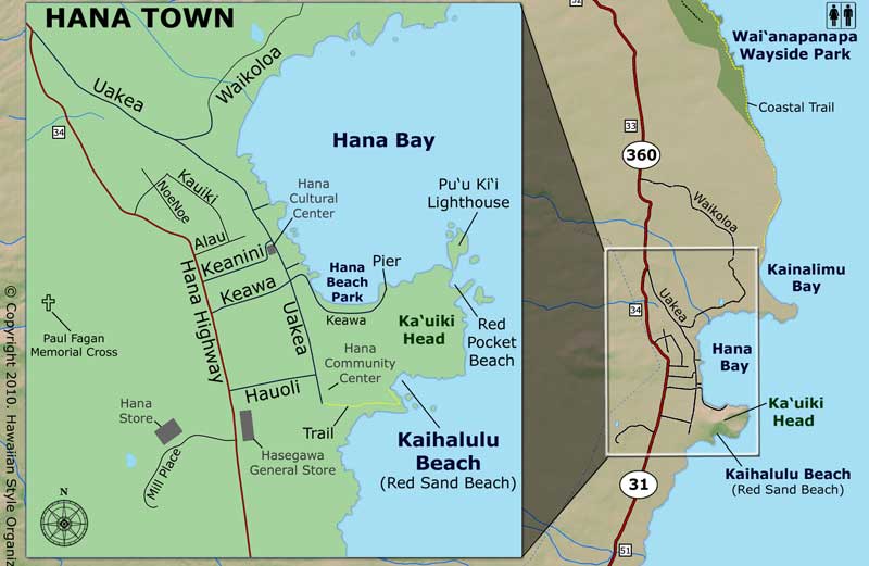 A lot of folks have asked us to create a simple Road to Hana map to go along with our more detailed highway maps. The road to Hana has more stops and sights to see than any other drive in Hawaii. Below you'll find a simple road map detailing the Road to Hana, officially known as the Hana Highway. We've also included four samples of our detailed Road to Hana maps (click them to see the larger versions); you can obtain the full high-resolution set of six (6) highly detailed maps in our Road to Hana eBook.