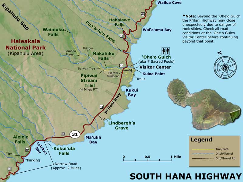 We also have a new version of the Road to Hana map without hillshades. This provides less topographic detail and may help you spot landmark labels more easily.