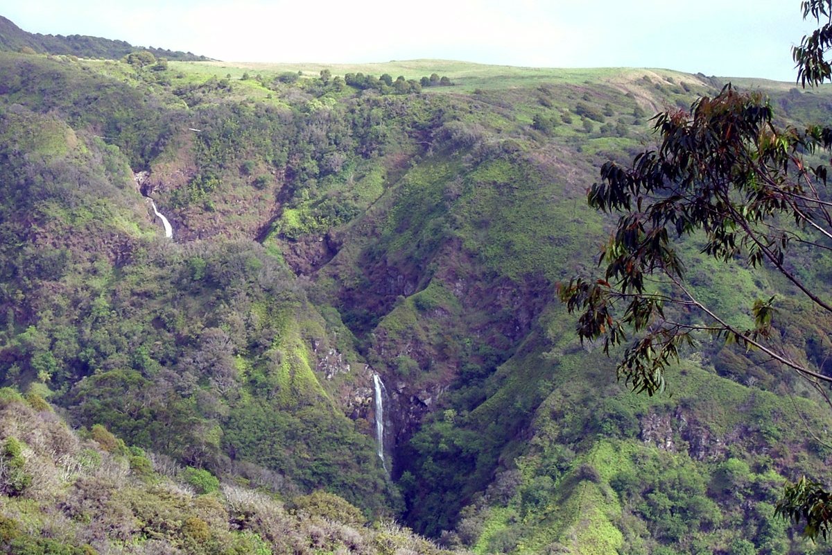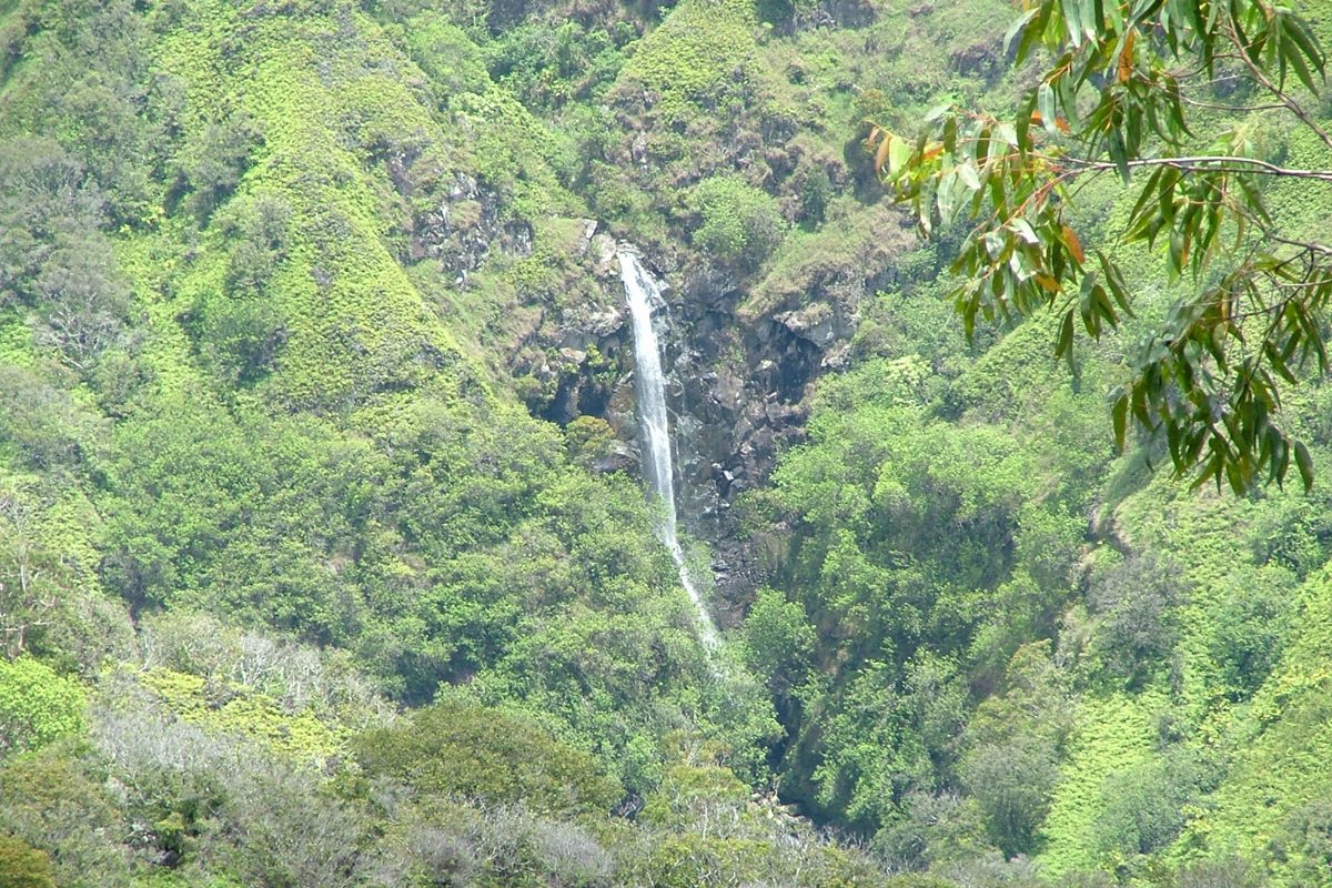 Makamaka`ole Falls is a large waterfall on Makamaka`ole Stream. It is visible along the Waihee Ridge trail. The best view is approximately at the one mile marker along the trail. The waterfall drops in several tiers, totaling about 270 ft. in height. You can also catch a glimpse of the falls on the Kahekili Highway (county route 340) along Maui's northwest coast. Just past mile marker 8 you should be able to see the waterfall down below in a small valley to your left. If it's been especially dry lately, the falls may not be currently flowing. As can be see via the photographs, it is a two-tier waterfall. Often the lower part of the waterfall is visible even when the upper level is not.