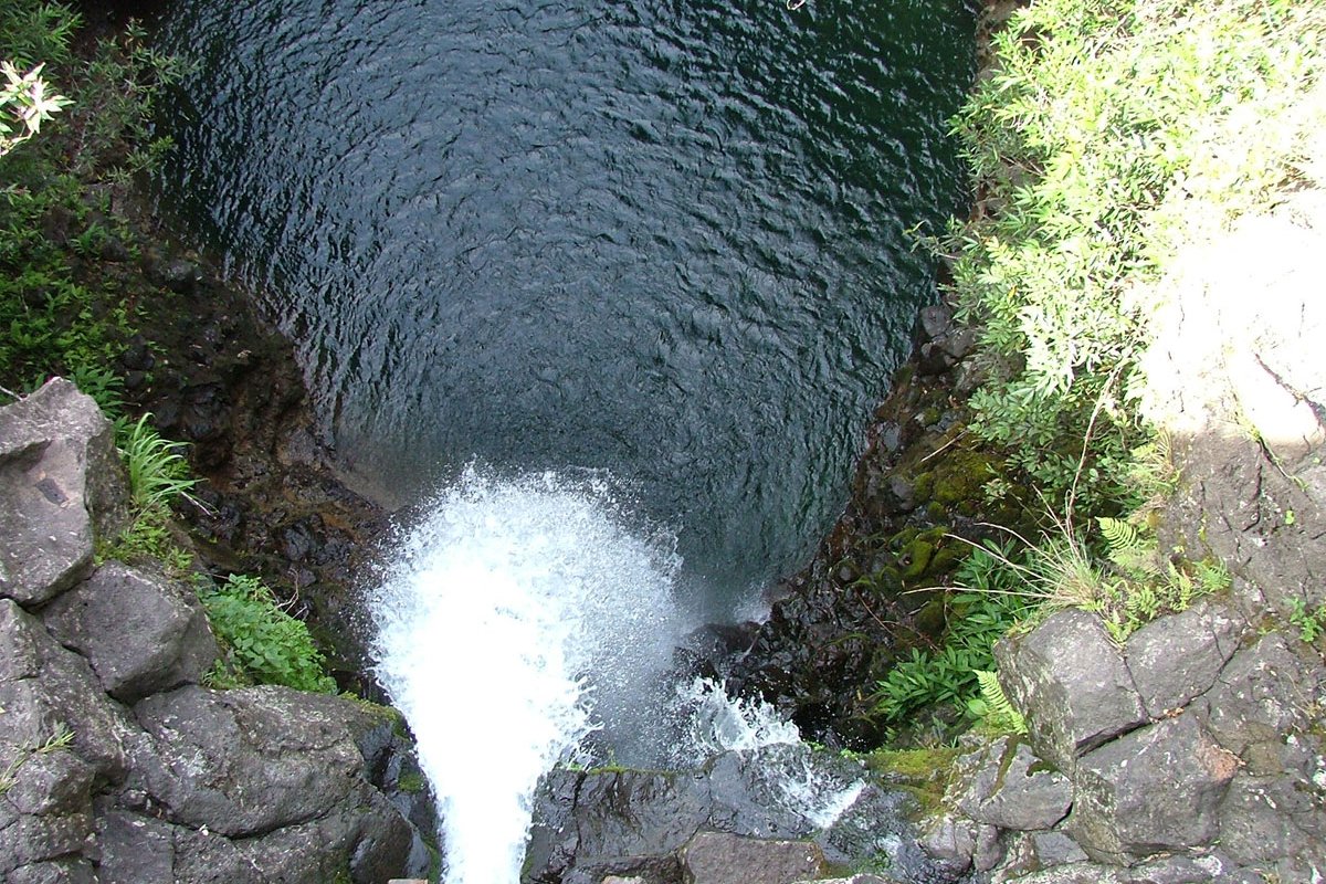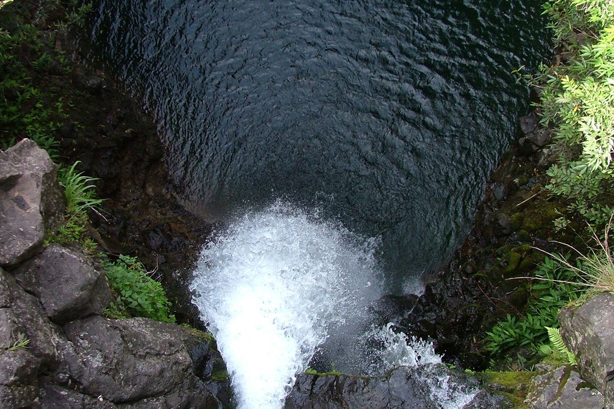 As you take the bridge over Makapipi stream near mile marker 25 on the Hana Highway be sure to stop to check out the falls under the bridge. Here you'll find Makapipi Falls, one of the most interesting falls on the Hana Highway. The Makapipi Stream flows within the lava streambed into a pristine blue pool. The Hana Highway crosses directly over the stream allowing folks a view of the falls over the bridge railing. The flow of the falls is dependent on rainfall, but if flowing is very intriguing to witness. To access this spot, park just beyond the bridge where there is a small pull off and walk back onto the bridge to look down on the makai side of the road.