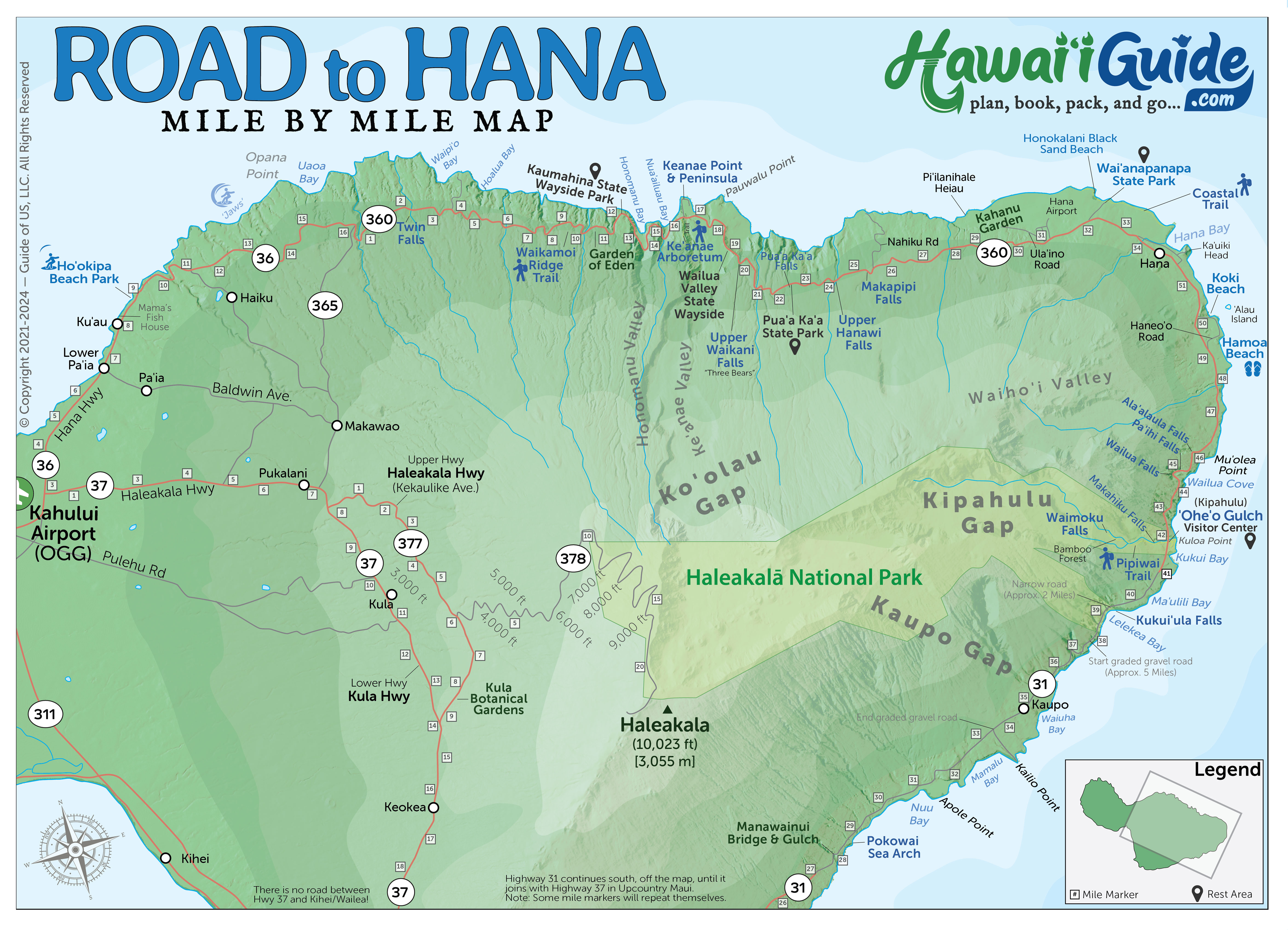 Updated for 2025 with a new high-resolution map of Maui with hill-shading turned on to provide topographic detail. Includes each of the Hana Highway's top attractions, trails, landmarks, and beaches with mile markers for the entire drive. Rest stops are also included.