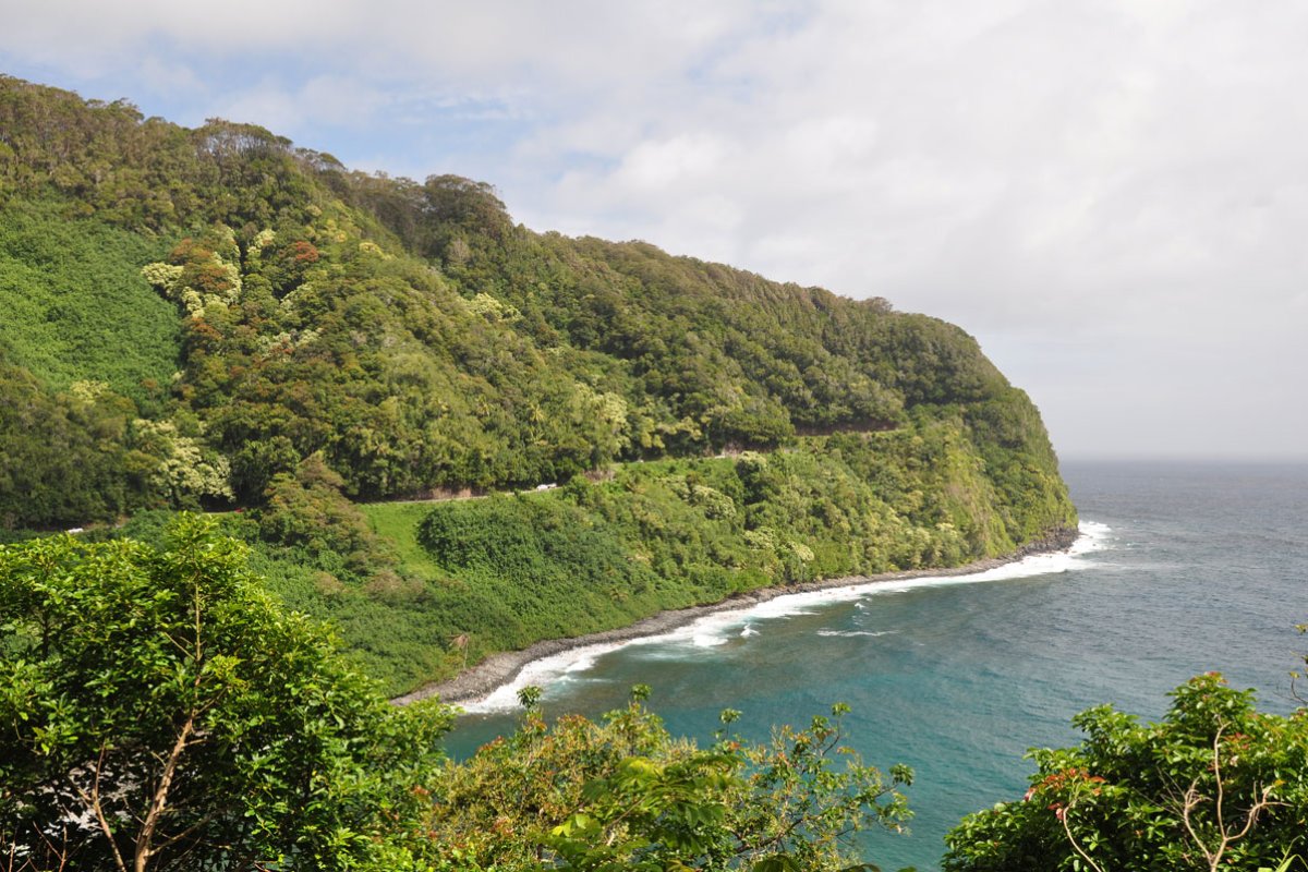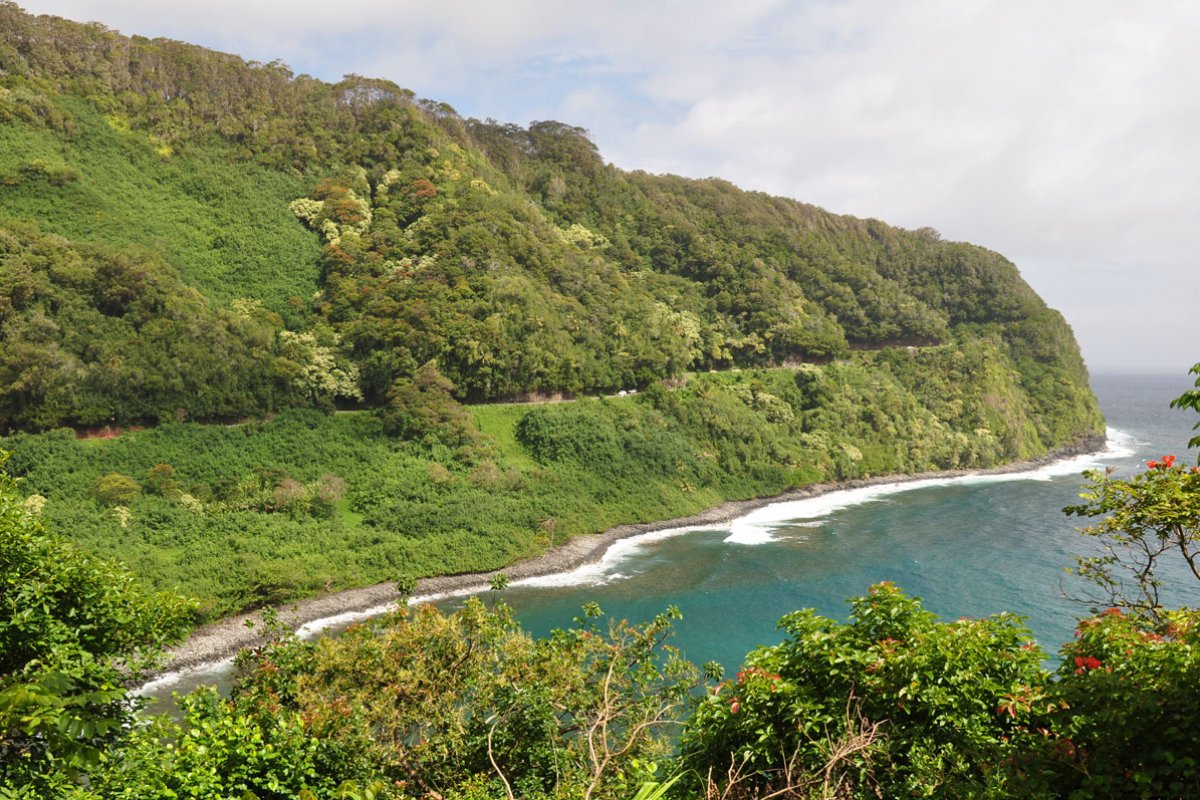 Most are as good as any other, but the two we've noted next are our favorites and are worth a quick stop. Makai, around mile marker 14, there is a pullout that overlooks the Hana Highway and Honomanu Bay back to your left. There is a huge parking lot on the mauka side of the highway here. This is a perfect location to take a picture of the winding highway along with Honomanu Bay. Down the road a bit further is another pullout, this time on a steep embankment with trees on top. This is the last place you can see such an expansive view of the highway as it twists and turns around the shore heading for Hana Town.