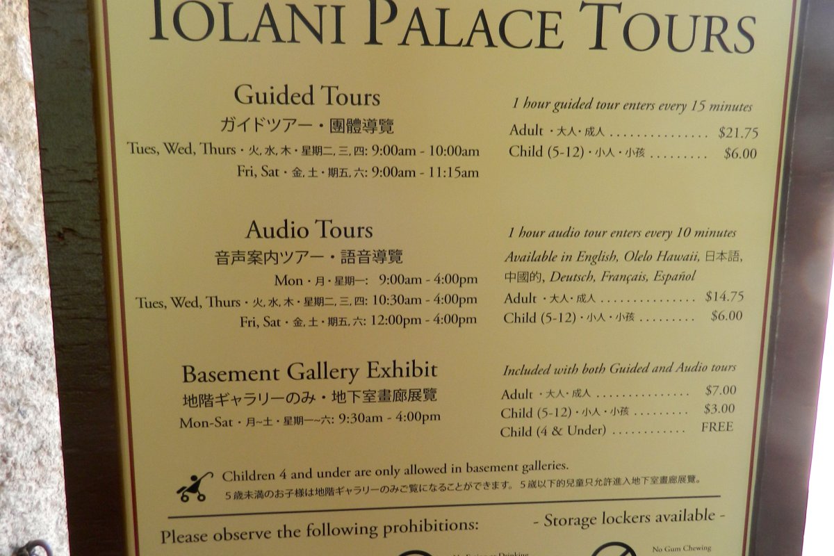 Ticket sales are online only. No walk-ups. The ticket window in Hale Koa (the Barracks building adjacent to Iolani Palace) will open for ticket distribution at 8:30 a.m. Groups are limited to 15 guests per entry time.