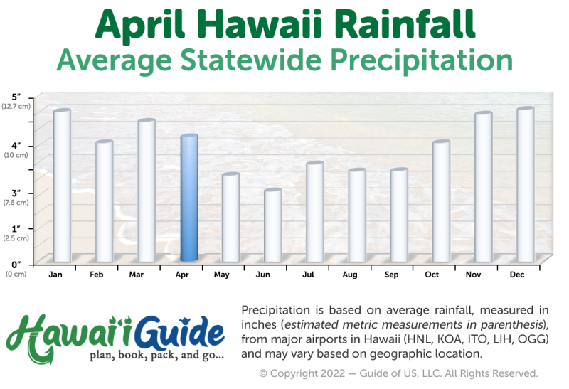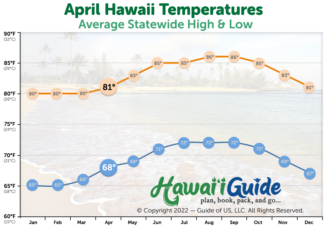 Spring is always a good time to travel to Hawaii. Unlike other areas, where the spring means rain, the rainy weather of the winter months is a distant memory in Hawaii. The daytime temperatures are comfortably warm, averaging in the high 70s and low 80s. Evenings are slightly colder and dip into the 60s, especially along the beaches. The warm waters of April invite you to frolic, bask in the sun, or learn to surf.
