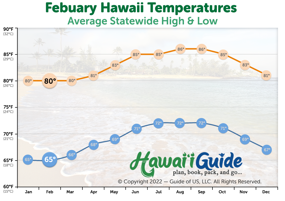 Hawaii in February sees ideal temperatures in the 78 to 80 F range. The waters and beaches remain warm and inviting all year round. With this weather, beaches are the perfect spot for sunbathing and water sports. The nights can get a little chilly in the mid to high 60s, especially if you are taking an evening stroll on the beach. Just pack a light sweater, and you’ll be fine.