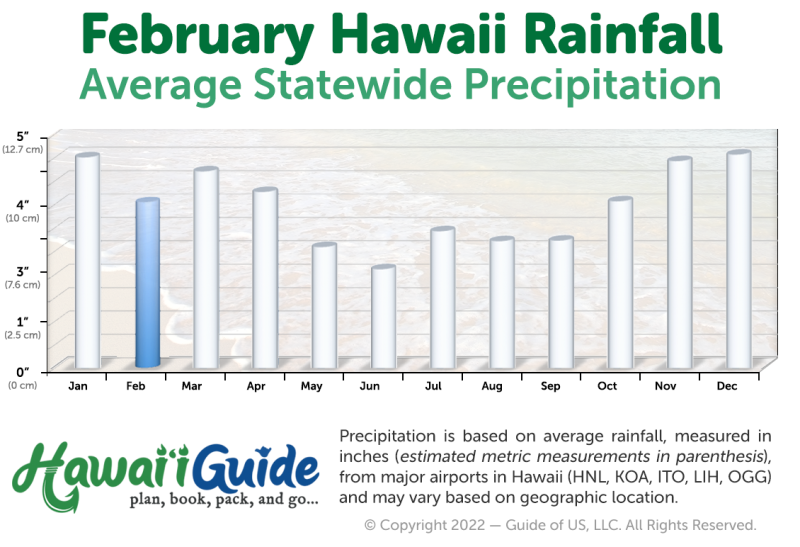 Other than a slightly higher chance of rain, February can be the perfect time for your Hawaiian stay. Fewer crowds, exciting whale watching, and reasonable rates all add to the attraction of the islands at this time of year.